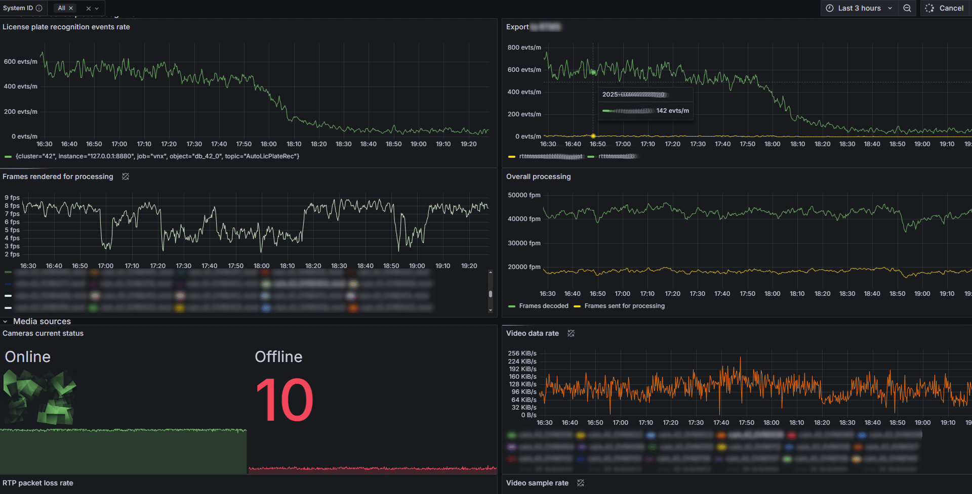 Even with this limited list a number of insights on how the distributed system works can be collected, to find possible failures or bottlenecks. Of course the dashboards really useful for day-to-day operations can be constructed by using the combination of viinex builtin scripts for sending application-specific events, and metrics collected from viinex event database. Let us know if you need any help with building a Grafana dashboard reflecting the data collected from viinex.